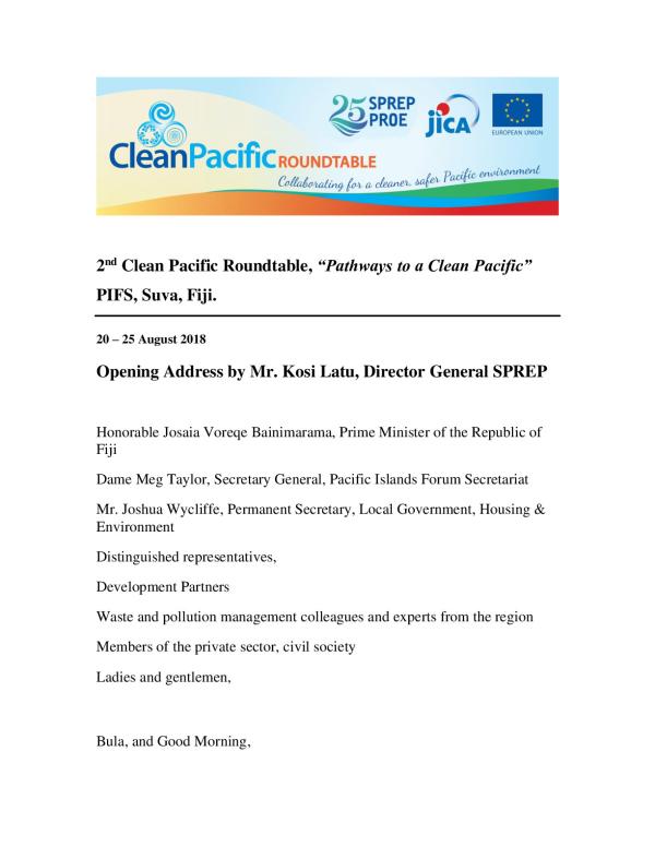 It is a great pleasure for me to welcome you all to Fiji to this 2nd Clean Pacific Roundtable meeting. It was just over 2years ago that we concluded a very successful, inaugural meeting, of the Clean Pacific Roundtable at the Holiday Inn in Suva.