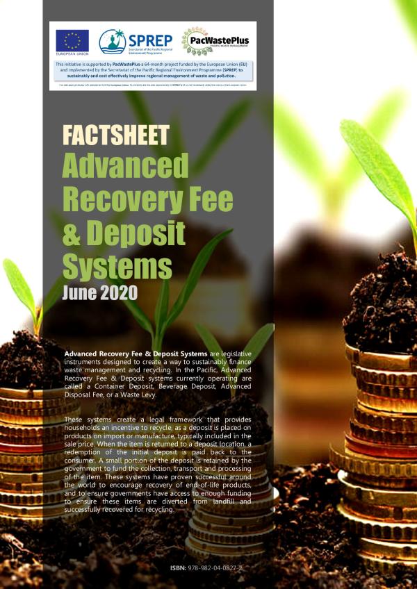 Advanced recovery fee & deposit systems are legislative instrument designed to create a way to sustainably finance waste management and recycling. In the Pacific, Advanced recovery fee & deposit systems currently operating are called a Container deposit, Beverage deposit, Advanced disposal fee or a Waste levy