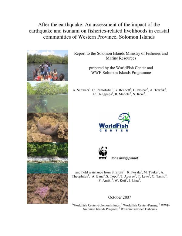 On 2 April 2007 a large earthquake and tsunami hit the western Solomon Islands causing varying degrees of damage and disruption to coastal communities. In order to assist with prioritisation of assistance to affected communities, the WorldFish Center and WWF-Solomon Islands (WWF-SI) combined to carry out an immediate assessment of impacts on selected villages within the affected area. This assessment was focused on immediate damage to and needs of the coastal fisheries, including environment and infrastructure, though the opportunity was taken to assess more general damage and threats to the long term, sustainable recovery of coastal fisheries.