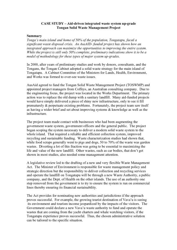 Tonga's main island and home of 50% of the population, Tongatapn, faced a significant waste disposal crisis. An AusAID- funded project has shown how an integrated approach can maximize the opportunities to improving the entire system. While the project is still only 50% complete, preliminary indications show it to be a model of methodology for these types of major system up-grades.