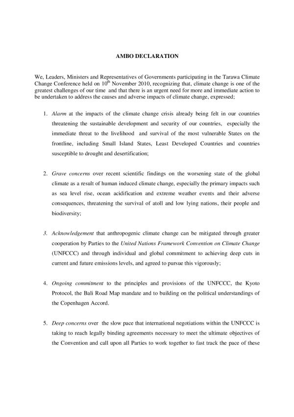 We, Leaders, Ministers and Representatives of Governments participating in the Tarawa Climate Change Conference held on 10th November 2010, recognizing that, climate change is one of the greatest challenges of our time and that there is an urgent need for more and immediate action to be undertaken to address the causes and adverse impacts of climate change