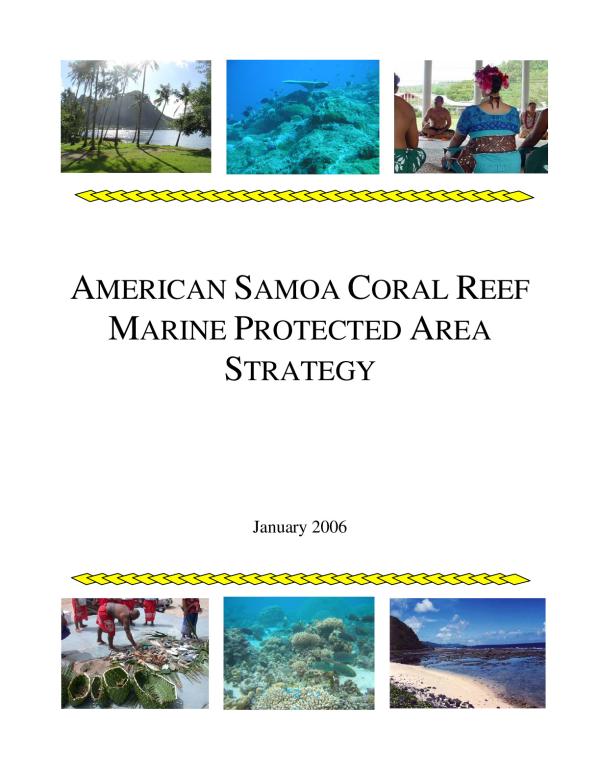 Coral reefs are an important natural resource in American Samoa providing protection, food, and other benefits. American Samoa's reefs have suffered numerous natural and anthropogenic destructive impacts including crown-of-thorns starfish infestations, coral bleaching events, cyclones, sedimentation and pollution. Marine Protected Areas (MPAs) are one form of management that can be used to address some of these threats to the reefs. Studies have shown that well-designed no-take reserves are particularly effective in maintaining biodiversity, productivity and ecological integrity of coral reefs (NOAA, 2002). MPAs also protect trophic systems and ecosystem resilience. On August 2, 2000 then-Governor Tauese Sunia requested a plan be developed for coral reef protection to reach the goal of protecting twenty percent (20%) of Territorial coral reefs as "no-take" MPA's (Sunia, 2000). To ensure effective management, the American Samoa Government has acknowledged the need for a Coral Reef MPA Strategy that can guide the creation of new no take MPAs. The American Samoa Coral Reef MPA Strategy covers the coral reef ecosystems in American Samoa, which are understood to include coral, seagrass, macroalgae, coralline algae, turf algae, emergent vegetation and mangroves.