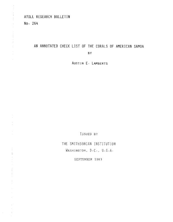 Reef coral collections from American Samoa are in the National Museum of Natural History, Smithsonian Institution, Washington, D.C., and in the Hessisches Landesmuseum, Darmstadt, W. Germany. The author has a collection of 790 coral specimens for a total of 1547 items known to be from American Samoa. A total of 177 species (including 3 species of non-scleractinian corals) belonging to 48 genera and subgenera (including the genera Millepora and Heliopora) known to date are listed with data as of frequency of occurrence and habitat.