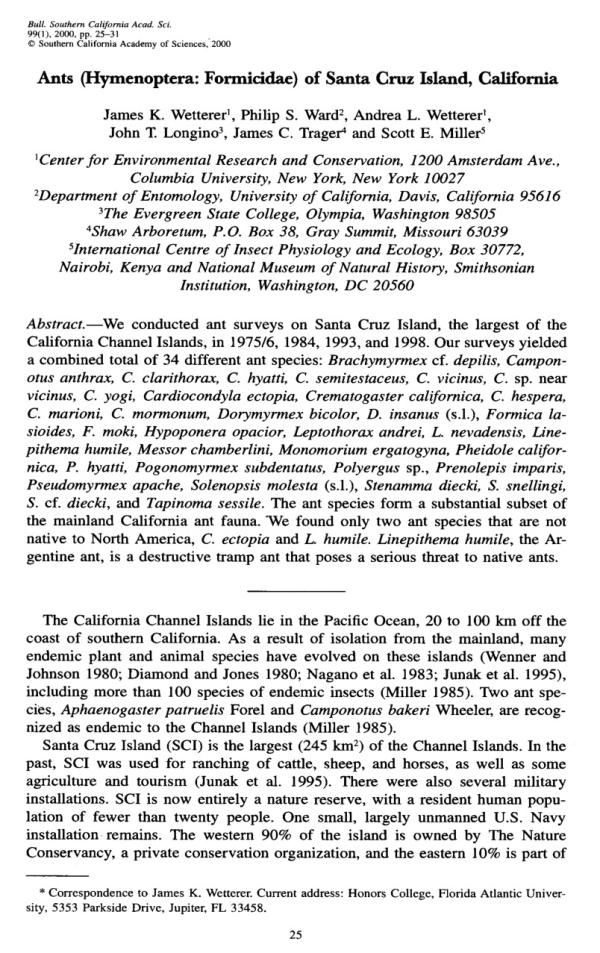 We conducted ant surveys on Santa Cruz Island, the largest of the California Channel Islands, in 1975/6, 1984, 1993 and 1998. Our surveys yielded a combined total of 34 different ant species: Brachymyrmex cf. depilis, Camponotus anthrax, C. clarithorax, C. hyatti, C. semitestaceus, C. vicinus, C. sp. near vicinus, C. yogi, Cardiocondyla ectopia, Crematogaster californica, C. hespera, C. marioni, C. mormonum, Dorymyrmex bicolor, D. insanus (s.l.), Formica lasioides, F. moki, Hypoponera opacior, Leptothorax andrei, L. nevadensis, Linepithema humile, Messor chamberlini, Monomorium ergatogyna, Pheidole californica, P. hyatti, Pogonomyrmex subdentatus, Polyergus sp., Prenolepis imparis, Pseudomyrmex apache, Solenopsis molesta (s.l.), Stenamma diecki, Sn. snellingi, S. cf. diecki, and Tapinoma sessile. The ant species form a substantial subset of the mainland California ant fauna. We found only two ant species that are not native to North America, C. ectopia and L. humile. Linepithema humile, the Argentine ant, is a destructive tramp ant that poses a serious threat to native ants. Record Created: 28-Nov-2000