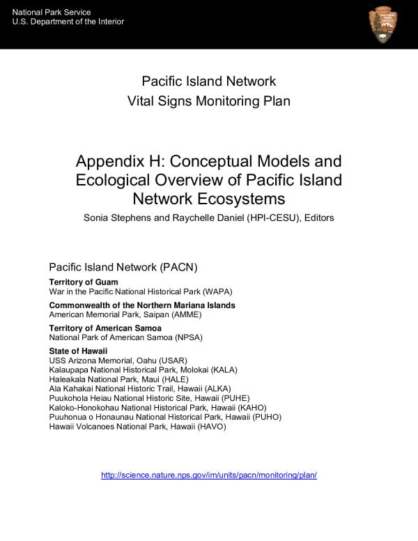 Development of conceptual models is an important step in the design of the Inventory and Monitoring Program. Conceptual models provide a framework for clarifying meaningful monitoring strategies, which enables us to progress from more general to more specific monitoring questions (Gross 2003). Monitoring efforts must be based on a fundamental understanding of how an ecosystem functions, which conceptual models provide. In addition, conceptual models promote communication among scientists, managers, and the public, providing a means for evaluation and discussion of ecosystem components. In two sections of the PACN Monitoring Plan, Chapter two and Appendix H, we present conceptual models developed to guide the design of the Network's long-term monitoring program.