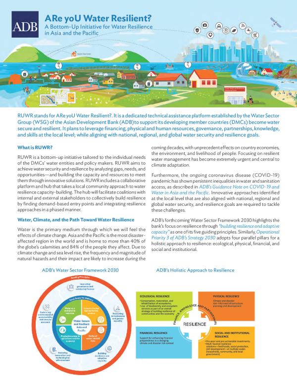 It is a dedicated technical assistance platform established by the Water Sector Group (WSG) of the Asian Development Bank (ADB) to support its developing member countiries (DMCs) become waste secure and resilient. It plans to leverage financing, physical and human resources, governance, partnerships, knowledge, and skills at the local level, while aligning with national, regional and global water security and resilience goals.