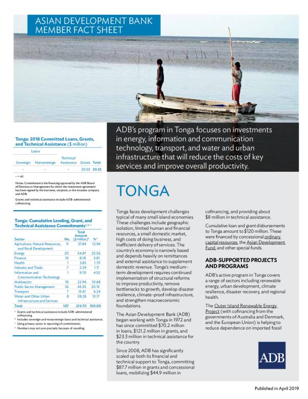 Asian Development Bank. ADBs program in Tonga focuses on investments in energy, information and communication technology, transport, and water and urban infrastructure that will reduce the costs of key services and improve overall productivity.