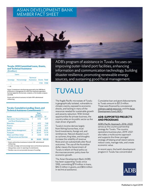 ADBs program of assistance in Tuvalu focuses on improving outer-island port facilities, enhancing information and communication technology, building disaster resilience, promoting renewable energy sources, and sustaining good fiscal management.