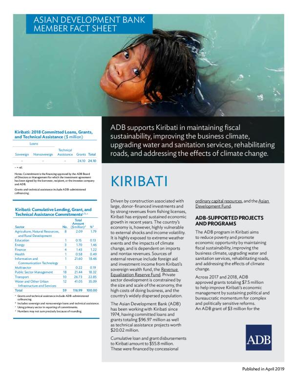 Asian Development Bank member fact sheet. ADB supports Kiribati in maintaining fiscal sustainability, improving the business climate, upgrading water and sanitation services, rehabilitating roads, and addressing the effects of climate change.