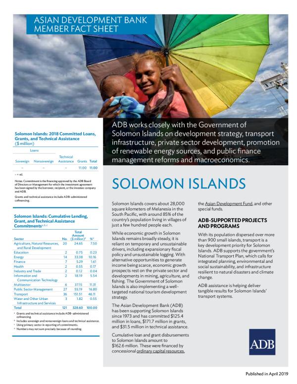 Asian Development Bank member fact sheet. ADB works closely with the Government of Solomon Islands on development strategy, transport infrastructure, private sector development, promotion of renewable energy sources, and public finance management reforms and macroeconomics.