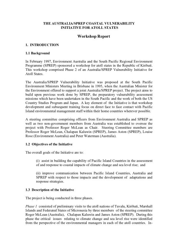 The Australia/SPREP Vulnerability Initiative was proposed at the South Pacific Environment Ministers Meeting in Brisbane in 1995. when the Australian Minister for the Environment offered to support a joint Australia/SPREP project. The project aims to build upon previous work done by SPREP. the preparatory vulnerability assessment missions which have been undertaken in the South Pacific and the work of both the US Country Studies Program and Japan. A key element of the Initiative is that workshop development and subsequent training focus 011 direct face to face contact with Pacific Island environmental management staff within their home countries wherever possible.