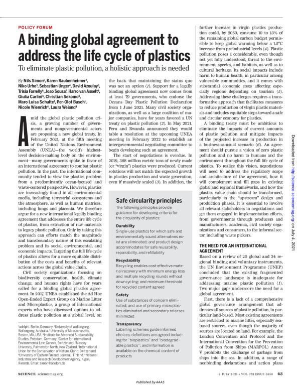 mid the global plastic pollution crisis, a growing number of governments and nongovernmental actors are proposing a new global treaty. In February 2021, at the fifth meeting of the United Nations Environment Assembly (UNEA)—the world’s highest level decision-making body on the environment—many governments spoke in favor of an international agreement to combat plastic pollution. In the past, the international community tended to view the plastics problem from a predominantly ocean-focused and waste-centered perspective. However, plastics are increasingly found in all environmental media, including terrestrial ecosystems and the atmosphere, as well as human matrices,including lungs and placenta.