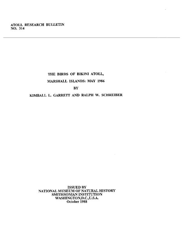 Field work conducted by the senior author at Bikini Atoll, Marshall Islands, in May 1986 yielded twenty-three species of birds; six of these were documented as nesting and an additional four species almost certainly nest as well. Six species were previously unrecorded for Bikini Atoll, and one of these, the Laughing Gull (Larus atricilla) was new to Micronesia. The recorded avifauna for Bikini Atoll now stands at twenty-six species. Major seabird colonies were located on Aomoen (and other northern islets), Nam, and Oroken/Jalete/Lukoj (and other southeastern islets). Scaevola and Tournefortia scrub and Pisonia grandis forests are the most frequently used habitats for nesting seabirds. Numerically, the most abundant breeding birds were the terns Anous minutus, A. stolidus and Gygis alba and the boobies Sula leucogaster and s. sula. Environmental rehabilitation options which minimize habitat alteration on the important nesting islets are recommended. Close monitoring and protection of seabird populations after Marshallese resettlement will guard against excessive disturbance and exploitation.