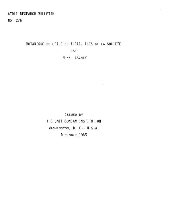 Lilie de Tupai ou Motu~Iti (16°15S, 15l°50,W), lun des cinq atolls des lies de la Societe, est, apres Bellingshausen (souvent ecrit Belling- hausen) (15°45S, 154°33W), le plus au nord de cet archipel, a 280 km NNW de Papeete. C'est grace a l'amabilite de son proprietaire, Maltre Marcel Lejeune, et a l'interet qu'il porte aux travaux scientifiques que j'ai pu y sejourner en Dec. 1974 et Mars 1983 (et F. R. Fosberg en Juin 1981). Qu'il veuille bien trouver ici, ainsi que son fils, l'expression de ma reconnaissance pour son hospitalite. Jai beneficie aussi de la gentillesse et des connaissances sur les plantes des residents de l'fle et, en 1983, de 1'assistance de mon collegue Bruno Delesalle, et je les en remercie. Bernard Salvat, qui visita Tupai en Juin 1983 ma communique ses photographies dont certaines sont reproduites ici, ce done je lui suis bien reconnaissante.