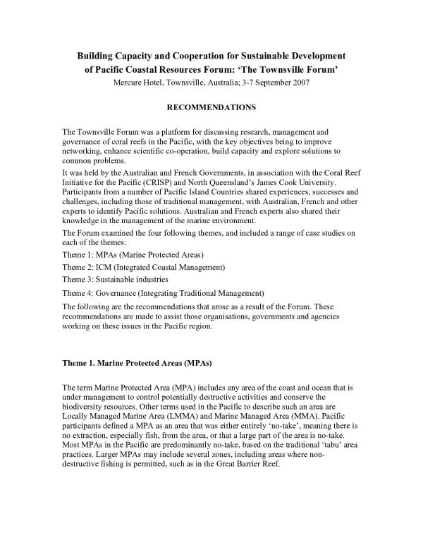 The term Marine Protected Area (MPA) includes any area of the coast and ocean that is under management to control potentially destructive activities and conserve the biodiversity resources. Other terms used in the Pacific to describe such an area are Locally Managed Marine Area (LMMA) and Marine Managed Area (MMA). Pacific participants defined a MP A as an area that was either entirely 'no-take', meaning there is no extraction, especially fish, from the area, or that a large part of the area is no-take. Most MP As in the Pacific are predominantly no-take, based on the traditional 'tabu' area practices. Larger MP As may include several zones, including areas where non-destructive fishing is permitted, such as in the Great Barrier Reef.
