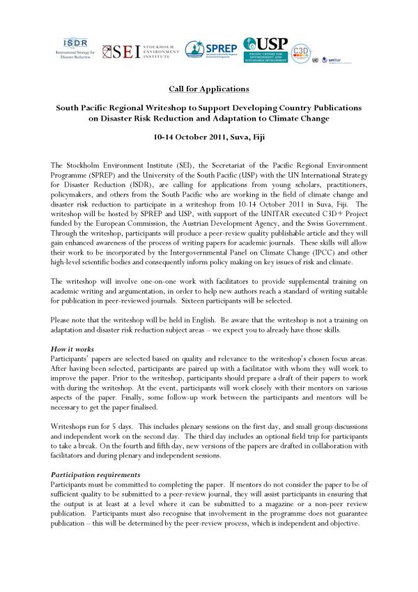 Microsoft Word - Call for applications_Pacific_final.docx Call for Applications South Pacific Regional Writeshop to Support Developing Country Publications on Disaster Risk Reduction and Adaptation to Climate Change 10-14 October 2011, Suva, Fiji The Stockholm Environment Institute (SEI), the Secretariat of the Pacific Regional Environment Programme (SPREP) and the University of the South Pacific (USP) with the UN International Strategy for Disaster Reduction (ISDR), are calling for applications from young scholars, practitioners, policymakers, and others from the South Pacific who are working in the field of climate change and disaster risk reduction to participate in a writeshop from 10-14 October 2011 in Suva, Fiji. The writeshop will be hosted by SPREP and USP, with support of the UNITAR executed C3D+ Project funded by the European Commission, the Austrian Development Agency, and the Swiss Government. Through the writeshop, participants will produce a peer-review quality publishable arti