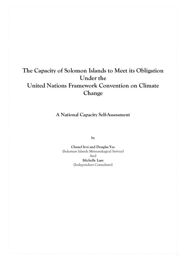 This is a report focusing on the capacity of Solomon Islands to meet its obligation under the United Nations Framework Convention on Climate Change (UNFCCC). The report is part of a National Capacity Self Assessment (NCSA) exercise that is being implemented through the United Nations Development Program (UNDP) with funding from the Global Environmental Facility (GEF). The Department of Environment and Conservation who is also the National GEF Focal Point is the lead agency responsible for the oversight and on-ground implementation of the exercise. Overall the NCSA has the task to assess the local capacity to meet not only the obligations under Climate Change Convention but also the UN Conventions on Bio-diversity and Land Degradation.