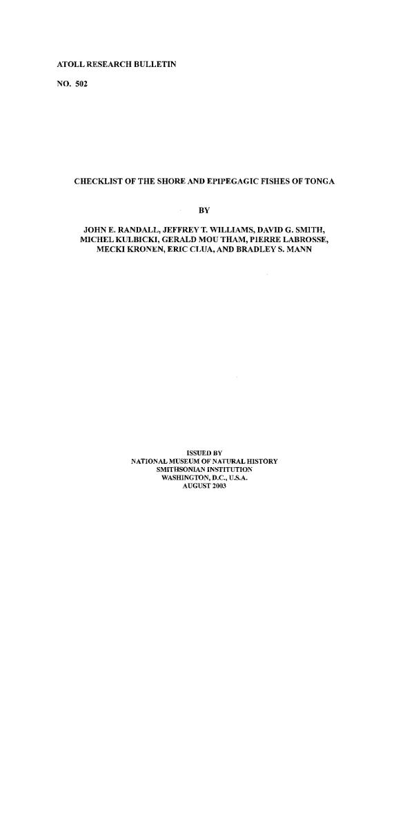 A checklist is given below of 1162 species of shore and epipelagic fishes belonging to 111 families that occur in the islands of Tonga, South Pacific Ocean; 40 of these are epipelagic species. As might be expected, the fish fauna of Tonga is most similar to those of Samoa and Fiji; at least 658 species of the fishes found in Tonga are also known from Fiji and the islands of Samoa. Twelve species of shore fishes are presently known only from Tonga. Specimens of Tongan fishes are housed mainly in the fish collections of the National Museum of Natural History, Washington D.C.; Bernice P. Bishop Museum, Honolulu; Museum National d'Histoire Naturelle, Paris; and the Australian Museum, Sydney. Native Tongan names of fishes, when known, are presented after species names.