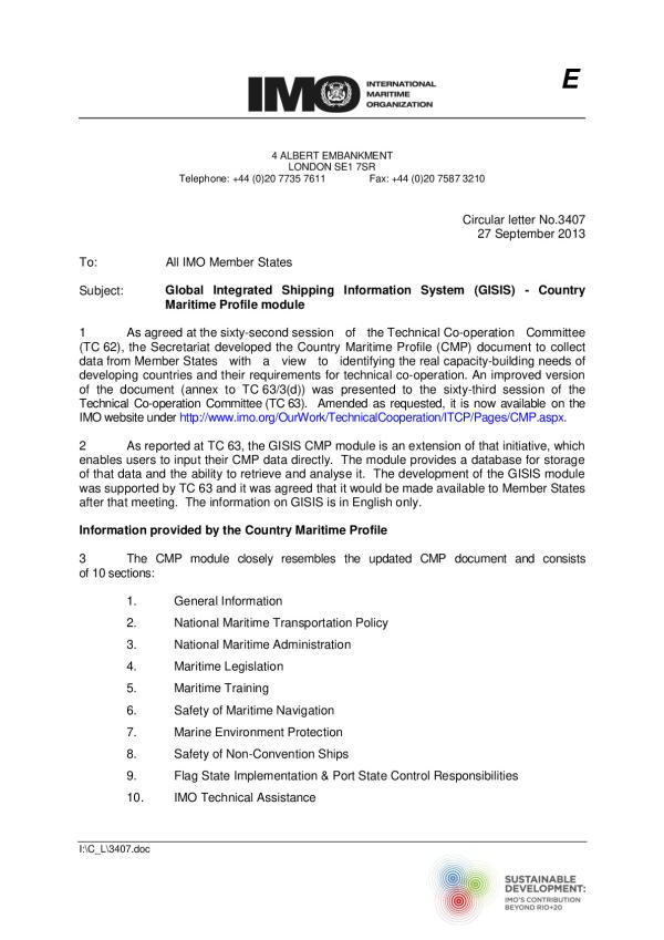 As agreed at the sixty-second session of the Technical Co-operation Committee (TC 62), the Secretariat developed the Country Maritime Profile (CMP) document to collect data from Member States with a view to identifying the real capacity-building needs of developing countries and their requirements for technical co-operation. An improved version of the document (annex to TC 63/3(d)) was presented to the sixty-third session of the Technical Co-operation Committee (TC 63). Amended as requested, it is now available on the IMO website under http://www.imo.org/OurWork/TechnicalCooperation/ITCP/Pages/CMP.aspx.