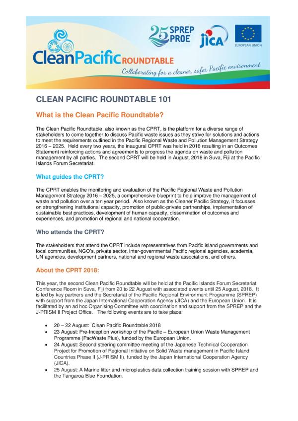 The Clean Pacific Roundtable, also known as the CPRT, is the platform for a diverse range of stakeholders to come together to discuss Pacific waste issues as they strive for solutions and actions to meet the requirements outlined in the Pacific Regional Waste and Pollution Management Strategy 2016 2025.
