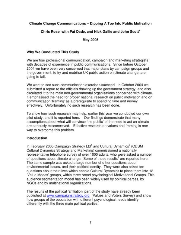 In February 2005 Campaign Strategy Ltd1 and Cultural Dynamics2 (CDSM Cultural Dynamics Strategy and Marketing) commissioned a nationally representative telephone survey of over 1000 adults, who were asked a number of questions about climate change. Some of those results3 are reported here. The same sample was asked a large number of other questions about environmental issues, and their political identity. They were also asked ten questions about their lives which enable Cultural Dynamics to place them into 12 Value Modes groups, within three broad psychological Motivational Groups. This audience segmentation model has been widely used by political parties, by NGOs and by multinational organizations.
