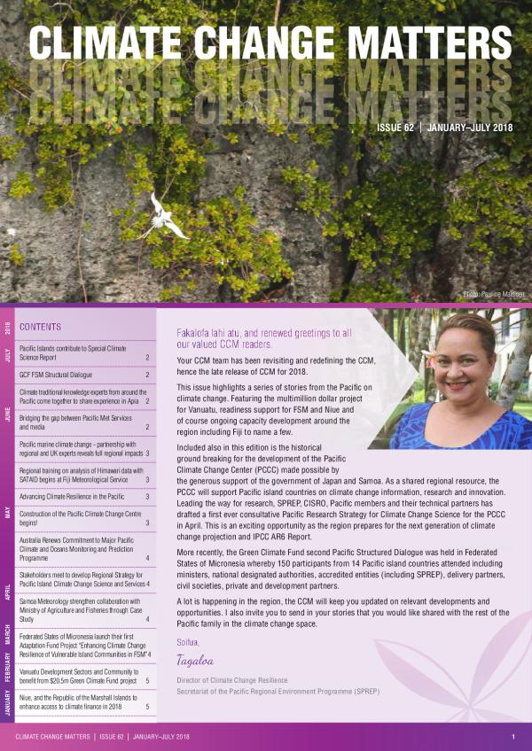 This issue highlights a series of stories from the Pacific on climate change. Featuring the multimillion dollar project for Vanuatu, readiness support for FSM and Niue and of course ongoing capacity development around the region including Fiji to name a few.