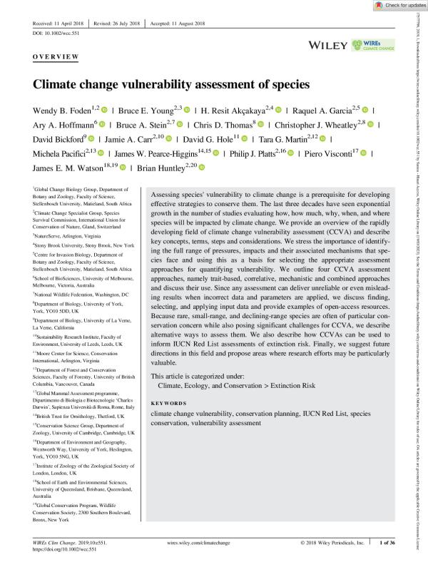 Assessing species' vulnerability to climate change is a prerequisite for developing effective strategies to conserve them. The last three decades have seen exponential growth in the number of studies evaluating how, how much, why, when, and where species will be impacted by climate change. We provide an overview of the rapidly developing field of climate change vulnerability assessment (CCVA) and describe key concepts, terms, steps and considerations. We stress the importance of identifying the full range of pressures, impacts and their associated mechanisms that species face and using this as a basis for selecting the appropriate assessment approaches for quantifying vulnerability. We outline four CCVA assessment approaches, namely trait?based, correlative, mechanistic and combined approaches and discuss their use. Since any assessment can deliver unreliable or even misleading results when incorrect data and parameters are applied, we discuss finding, selecting, and applying input data and provide examples of open?access resources. Because rare, small?range, and declining?range species are often of particular conservation concern while also posing significant challenges for CCVA, we describe alternative ways to assess them. We also describe how CCVAs can be used to inform IUCN Red List assessments of extinction risk. Finally, we suggest future directions in this field and propose areas where research efforts may be particularly valuable.