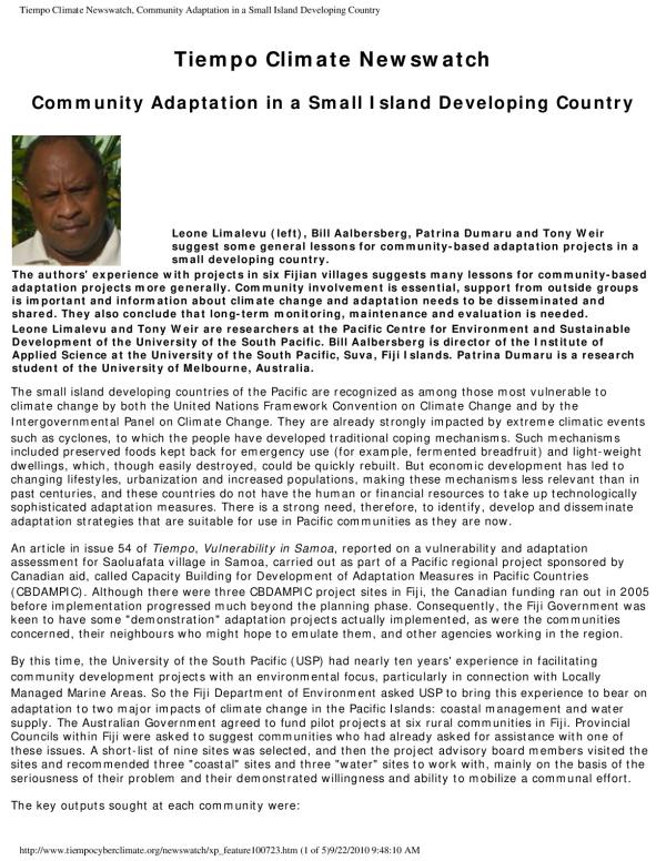 Tiempo Climate Newswatch, Community Adaptation in a Small Island Developing CountryTiempo Climate Newswatch, Community Adaptation in a Small Island Developing Country Tiempo Climate Newswatch Community Adaptation in a Small Island Developing Country Leone Limalevu (left), Bill Aalbersberg, Patrina Dumaru and Tony Weir suggest some general lessons for community-based adaptation projects in a small developing country. The authors' experience with projects in six Fijian villages suggests many lessons for community-based adaptation projects more generally. Community involvement is essential, support from outside groups is important and information about climate change and adaptation needs to be disseminated and shared. They also conclude that long-term monitoring, maintenance and evaluation is needed. Leone Limalevu and Tony Weir are researchers at the Pacific Centre for Environment and Sustainable Development of the University of the South Pacific. Bill Aalbersberg is director of the Institute of Applied