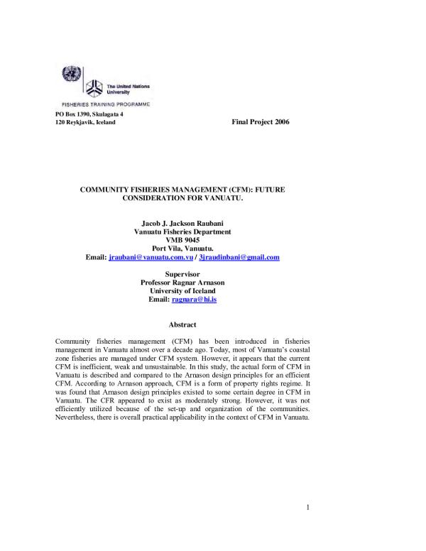 Community fisheries management (CFM) has been introduced in fisheries management in Vanuatu almost over a decade ago. Today, most of Vanuatu's coastal zone fisheries are managed under CFM system. However, it appears that the current CFM is inefficient, weak and unsustainable. In this study, the actual form of CFM in Vanuatu is described and compared to the Amason design principles for an efficient CFM. According to Arnason approach, CFM is a form of property rights regime. It was found that Arnason design principles existed to some certain degree in CFM in Vanuatu. The CFR appeared to exist as moderately strong. However, it was not efficiently utilized because of the set-up and organization of the communities. Nevertheless, there is overall practical applicability in the context of CFM in Vanuatu.