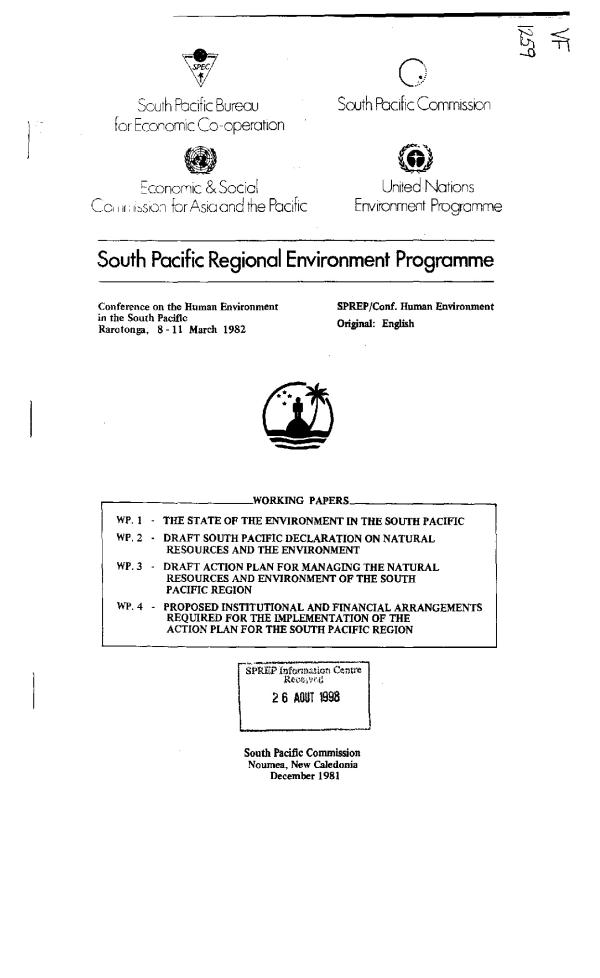 WP.1 The State of the environment in the South Pacific|WP.2 Draft South Pacific declaration on natural resources and the environment|WP.3 Draft action plan for managing the natural resources and environment of the South Pacific region|WP.4 Proposed institutional and financial arrangements required for the implementation of the action plan for the South Pacific region