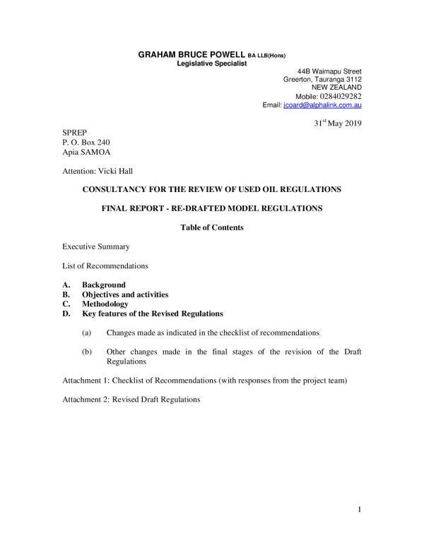Draft Model Used Oil Regulations have been comprehensively reviewed with a view to modifying them to facilitate the Draft Regulations being adopted as law by as many countries in the Pacific region as is possible.
