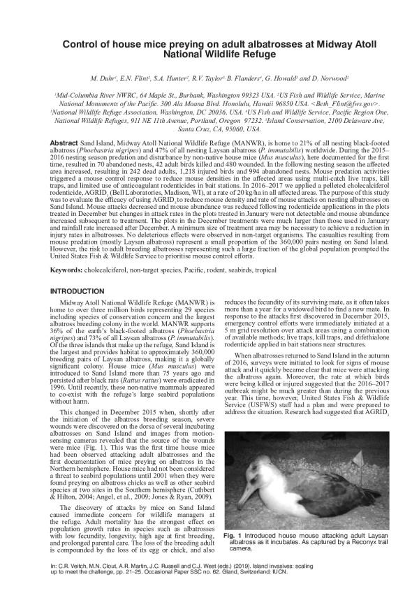 Sand Island, Midway Atoll National Wildlife Refuge (MANWR), is home to 21% of all nesting black-footed albatross (Phoebastria nigripes) and 47% of all nesting Laysan albatross (P. immutabilis) worldwide. During the 20152016 nesting season predation and disturbance by non-native house mice (Mus musculus), here documented for the first time, resulted in 70 abandoned nests, 42 adult birds killed and 480 wounded. In the following nesting season the affected area increased, resulting in 242 dead adults, 1,218 injured birds and 994 abandoned nests. Mouse predation activities triggered a mouse control response to reduce mouse densities in the affected areas using multi-catch live traps, kill traps, and limited use of anticoagulant rodenticides in bait stations. In 20162017 we applied a pelleted cholecalciferol rodenticide, AGRID (Bell Laboratories, Madison, WI), at a rate of 20 kg/ha in all affected areas. The purpose of this study was to evaluate the efficacy of using AGRID to reduce mouse density and rate of mouse attacks on nesting albatrosses on Sand Island. Mouse attacks decreased and mouse abundance was reduced following rodenticide applications in the plots treated in December but changes in attack rates in the plots treated in January were not detectable and mouse abundance increased subsequent to treatment. The plots in the December treatments were much larger than those used in January and rainfall rate increased after December. A minimum size of treatment area may be necessary to achieve a reduction in injury rates in albatrosses. No deleterious effects were observed in non-target organisms. The casualties resulting from mouse predation (mostly Laysan albatross) represent a small proportion of the 360,000 pairs nesting on Sand Island. However, the risk to adult breeding albatrosses representing such a large fraction of the global population prompted the United States Fish & Wildlife Service to prioritise mouse control efforts.