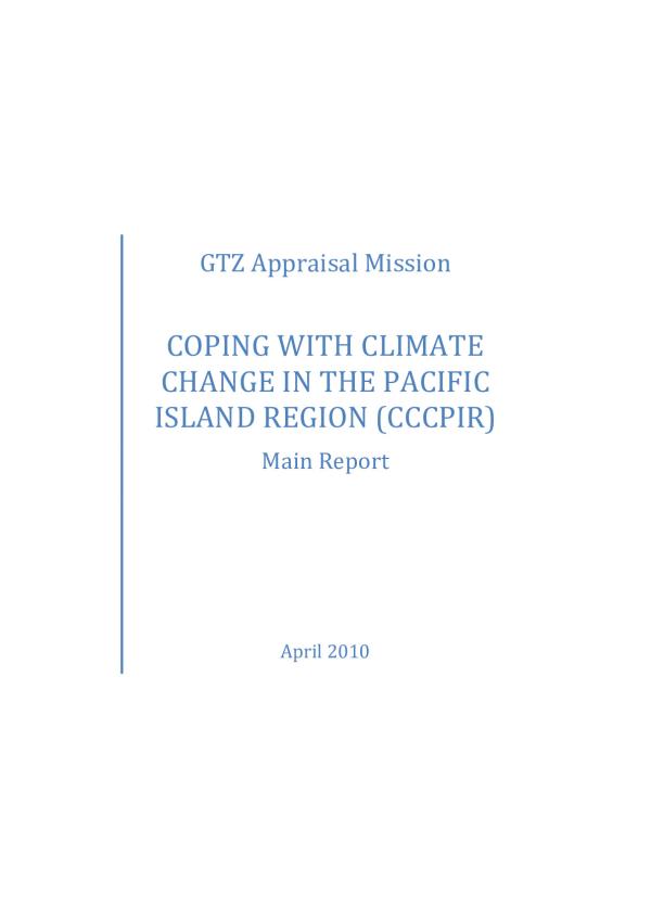 Within the context of an additional commitment of the German Federal Ministry for Economic Cooperation and Development (BMZ) for the ongoing ACCPIR Project GTZ commissioned an appraisal mission in order to investigate the options for extending it regionally and thematically. The regional scope of the mission includes all independent member states of the Secretariat of the Pacific Community (SPC). The thematic scope of the mission focused on climate change adaptation strategies for land- and marine based natural resources, adaptation options in the tourism sector and with regard to mitigation potentials to renewable energies as well as energy efficiency issues. Despite constraints in terms of time covering the whole South Pacific region, the regional institutional framework being under reconstruction and, the multitude of, hardly manageable donor initiatives in the field of climate change the team finally was confident that sufficient information was available to assess the climate change context of the region and to come up with a proposal which adds value to ongoing and planned climate change activities at the regional and national level.