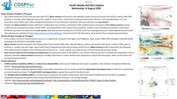 Ocean Outlook, fortnight to 29 August: • Sea surface temperature (SST) forecasts more than 0.8°C above-normal are favoured in the following country Exclusive Economic Zone (EEZs): southern FSM, PNG, Solomon Is., Vanuatu, New Caledonia, most of Fiji, southern Tuvalu, W & F, central French Polynesia and northern Pitcairn Is. SST anomalies above 1.2°C are favoured in most of PNG, parts of New Caledonia and patches of French Polynesia. Elsewhere, SSTs are predicted to be near-normal.