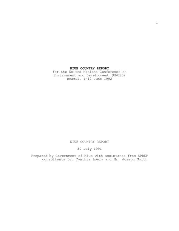 3 copies and one copy kept in VF 0749|Niue country report for the United Nations Conference on Environment and Development (UNCED) Brazil, 1-12 June 1992.|Prepared by Government of Niue with assistance from SPREP consultants Dr. Cynthia Lowry and Mr. Joseph Smit