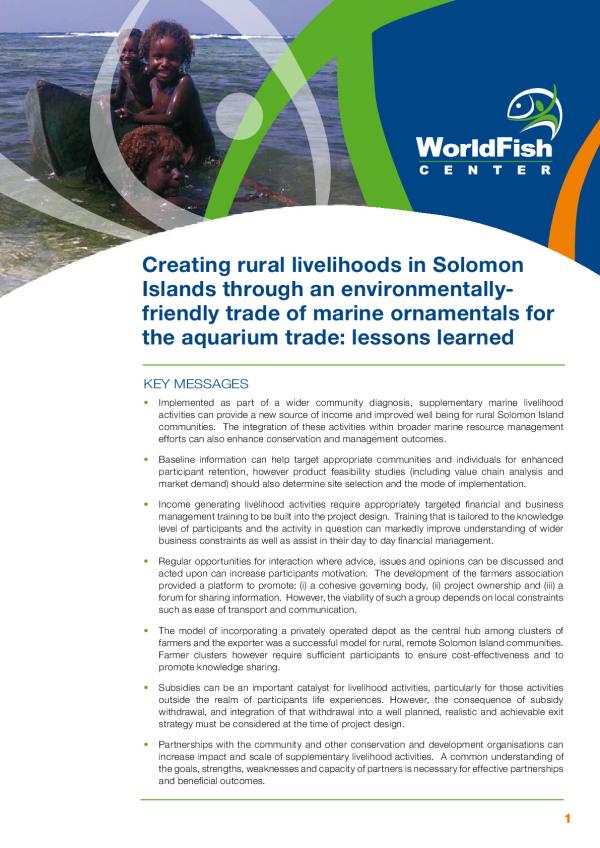 The marine ornamental trade became active in Solomon Islands in the mid-1980s, primarily through the wild harvest of corals and fish. The initiation of more sustainable techniques (cultured giant clams and farmed corals) did not occur until the late-1990s through projects initiated under the auspices of ICLARM (former WorldFish) (Kinch, 2004). Since that time the marine ornamental trade (still primarily through wild harvest) has provided a modest income for some rural coastal communities in Solomon Islands (with a reduced trade and a cessation of the production of giant clams during the 1999 2001 ethnic tension), and two exporting companies remain active.