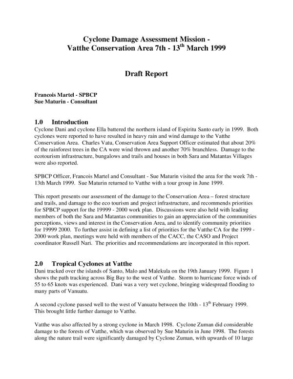 Cyclone Dani and cyclone Ella battered the northern island of Espiritu Santo early in 1999. Both cyclones were reported to have resulted in heavy rain and wind damage to the Vatthe Conservation Area. Charles Vatu, Conservation Area Support Officer estimated that about 20% of the rainforest trees in the CA were wind thrown and another 70% branchless. Damage to the ecotourism infrastructure, bungalows and trails and houses in both Sara and Matantas Villages were also reported.