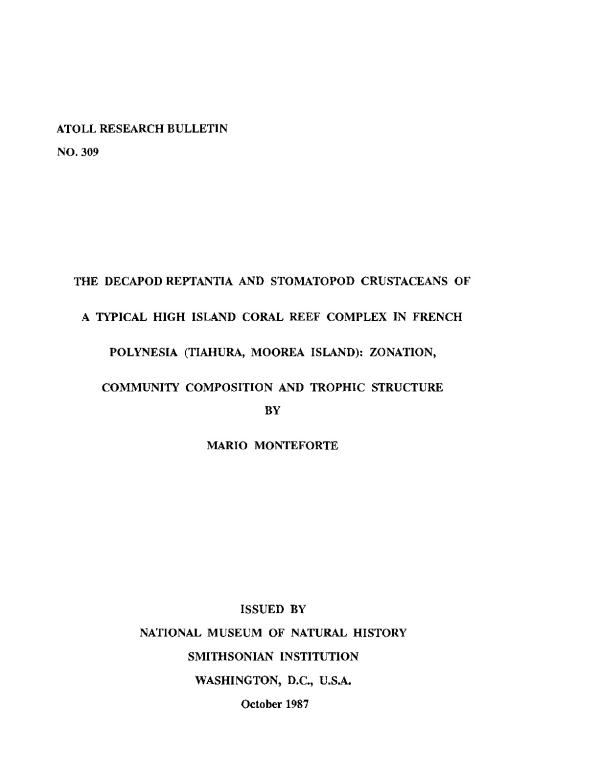 In a typical High Island coral reef complex of French Polynesia (transect of Tiahura, Hoorea Island, Society Archipelago!, 73 species of decapod Reptantia and stomatopod crustaceans were collected. Over 9 stations localised along the transect, 3 different units of hard coral substrate of simi1ar volume (about 17 litres each), were sampled at each station. The results are discussed from two aspects : the first shows that at least 50 carcinologic species occur within the cavitary biotopes ; 16 species (mainly Xanthid crabs), represent more than 90% of all collected individuals. Most of the dominant species are widely distributed along the transect (Chlorodiella barbata, Pilodius pugil, Lipcarpilodes integerrimus, Galathea aculeata), and locally, some others are numerically important (Chlorodiella Laevissima, Globopilumnus globosus, Daira perlata,Phymodius ungulatus, etc.). The second aspect concerns the repartition of species in the different biotopes in relation to their feeding habits. Based on the functional morphology of chelipeds, mouth-parts and gastric sill, and on gut content analysis, the species were placed into 5 MORPHO- LOGIC GROUPS : filter-suspension feeders, omnivores/herbivores, omnivores/carnivores, generalised omnivores and predators. The feeding habits and the distribution pattern of abundant species suggest that trophic and habitat partitioning say exist. The predominant species show either different nutritional modes, or inhabit different areas and/or biotopes. Distribution patterns of the morphologic groups ip the different substrates are proposed, and schemes of interspecific relation; are analysed.