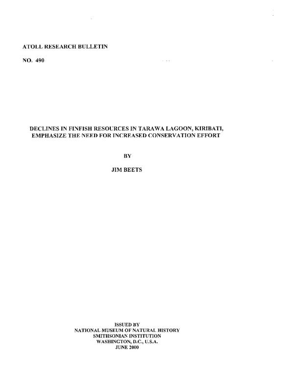 The very productive lagoon fisheries of Tarawa atoll changed greatly in recent decades as human development and intensive harvesting increased. Tarawa typifies the increasingly common condition of resource depletion and marine community structure change with expanding human activities and population growth. Fisheries-dependent reports have documented the change in fisher landings for nearly two decades. A comparison of fisheries-independent data collected during 1992-93 with data collected in 1977 allowed for documentation of large changes in important finfish resources in Tarawa Lagoon. The historically important bonefish (Albula glossodonta), like other important fishery species, demonstrated declines in catch-per-unit effort (CPUE), proportion of catch, mean length and weight (1977: 46.4 cm, 1.31 kg; 1992-93: 37.6 cm and 0.84 kg), and sex ratio (1977: 0.71:1 [F:M]; 1992-93: 0.15:1). Beach seine sampling of bait fishes demonstrated a major shift in species composition between 1977 and 1992- 93, with severe depletion of some preferred species. These results suggest declining abundance in locally important fish species and large changes in species composition within Tarawa Lagoon.