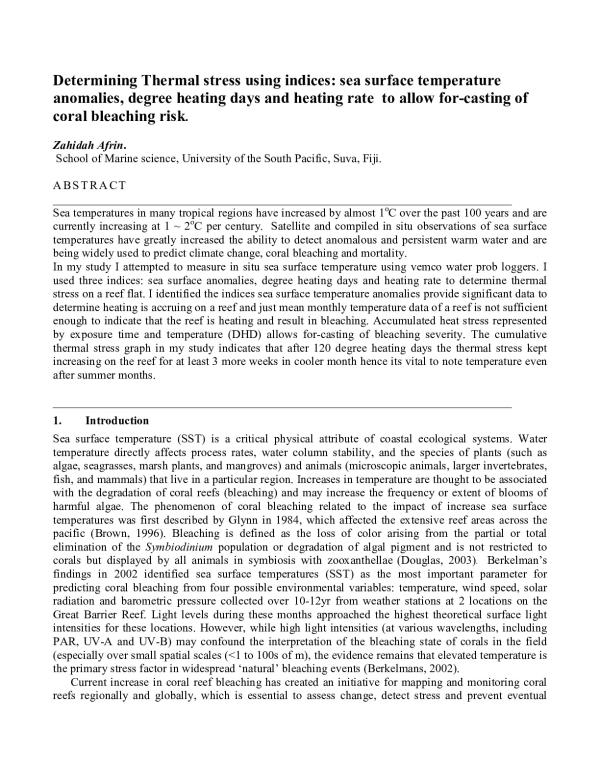 Sea temperatures in many tropical regions have increased by almost 1°C over the past 100 years and are currently increasing at 1 ~ 2°C per century. Satellite and compiled in situ observations of sea surface temperatures have greatly increased the ability to detect anomalous and persistent warm water and are being widely used to predict climate change, coral bleaching and mortality. In my study I attempted to measure in situ sea surface temperature using vemco water prob loggers. I used three indices: sea surface anomalies, degree heating days and heating rate to determine thermal stress 011 a reef flat. I identified the indices sea surface temperature anomalies provide significant data to determine heating is accruing on a reef and just mean monthly temperature data of a reef is not sufficient enough to indicate that the reef is heating and result in bleaching. Accumulated heat stress represented by exposure time and temperature (DHD) allows for-casting of bleaching severity. The cumulative thermal stress graph in my study indicates that after 120 degree heating days the thermal stress kept increasing on the reef for at least 3 more weeks in cooler month hence its vital to note temperature even after summer months.