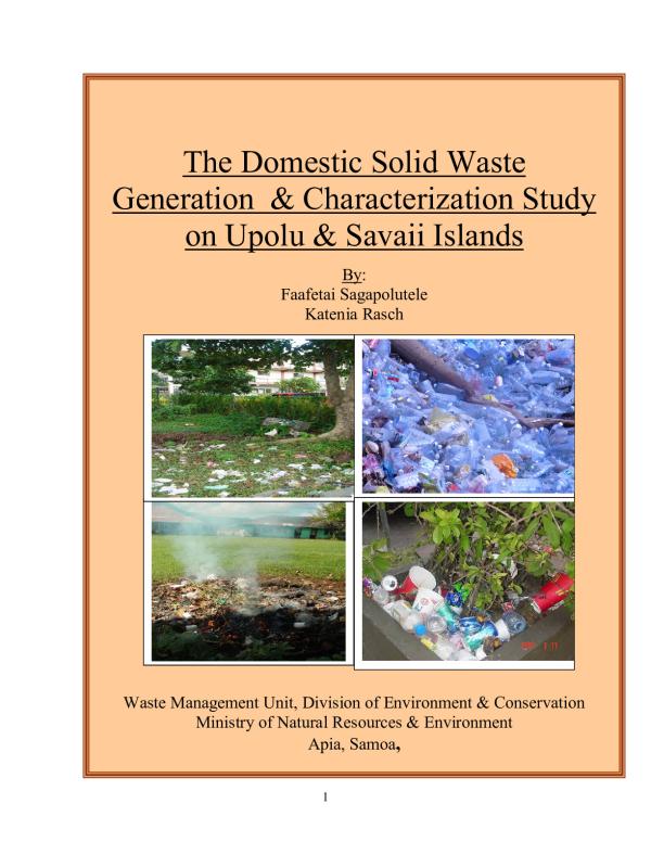 Microsoft Word - DOMESTIC GENERATION REPORT_small.doc 1 ACKNOWLEDGEMENT I wish to acknowledge the assistances and help of everyone in carrying out the two surveys in 2006 and 2007, which provide the basis of this report. Without your contribution, we would not be able to put together this report Firstly, I would like to commend the great contributions from the students of the National University of Samoa whose assistances had made the practical aspects of this study possible. We also want to specially thank the National University of Samoa for allowing the students to participate during these two separate surveys in 2006 and 2007. Your on going participation in carrying out similar surveys in the future is needed in order for the government to have the required baseline information required for appropriate future programs and actions. Secondly, I wish to thank the Meteorology Division for offering funds to implement these two separate solid waste surveys on Upolu and Savaii