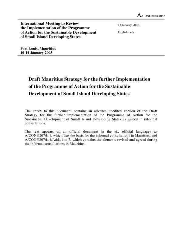 Available online|The annex to this documnet contains an advance unedited version of the Draft Strategy for the further implementation of the Programme of Action for the Sustainable Development of Small Island Developing States as agreed in informal consultations