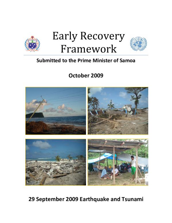 The goal of the Early Recovery Framework is to present clearly to Government, donors and the wider community costed options designed to bring about an early recovery process that is both effective in meeting the needs of the population affected by the 29 September 2009 earthquake and subsequent tsunami, and sustainable in the long-term development of affected communities and the economy of Samoa. The Framework takes into account the longer-term rehabilitation and reconstruction plans of the Government and local communities with an aim to capitalize on opportunities to reinvigorate existing policies and plans for disaster risk reduction and to rebuild communities better. Opportunities for economic revitalization outside the normal scope of livelihood options in the affected areas could not only be good for the changed environment and resource base in these areas, but also may act as a catalyst for the active participation of all age groups and genders amongst the affected populations.