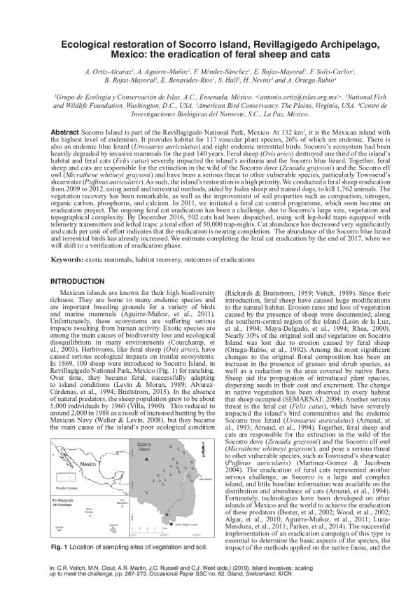 Socorro Island is part of the Revillagigedo National Park, Mexico. At 132 km2, it is the Mexican island with the highest level of endemism. It provides habitat for 117 vascular plant species, 26% of which are endemic. There is also an endemic blue lizard (Urosaurus auriculatus) and eight endemic terrestrial birds. Socorros ecosystem had been heavily degraded by invasive mammals for the past 140 years. Feral sheep (Ovis aries) destroyed one third of the islands habitat and feral cats (Felis catus) severely impacted the islands avifauna and the Socorro blue lizard. Together, feral sheep and cats are responsible for the extinction in the wild of the Socorro dove (Zenaida graysoni) and the Socorro elf owl (Micrathene whitneyi graysoni) and have been a serious threat to other vulnerable species, particularly Townsends shearwater (Pu?nus auricularis). As such, the islands restoration is a high priority. We conducted a feral sheep eradication from 2009 to 2012, using aerial and terrestrial methods, aided by Judas sheep and trained dogs, to kill 1,762 animals. The vegetation recovery has been remarkable, as well as the improvement of soil properties such as compaction, nitrogen, organic carbon, phosphorus, and calcium. In 2011, we initiated a feral cat control programme, which soon became an eradication project. The ongoing feral cat eradication has been a challenge, due to Socorros large size, vegetation and topographical complexity. By December 2016, 502 cats had been dispatched, using soft leg-hold traps equipped with telemetry transmitters and lethal traps: a total e? ort of 50,000 trap-nights. Cat abundance has decreased very signi?cantly and catch per unit of e? ort indicates that the eradication is nearing completion. The abundance of the Socorro blue lizard and terrestrial birds has already increased. We estimate completing the feral cat eradication by the end of 2017, when we will shift to a veri?cation of eradication phase.