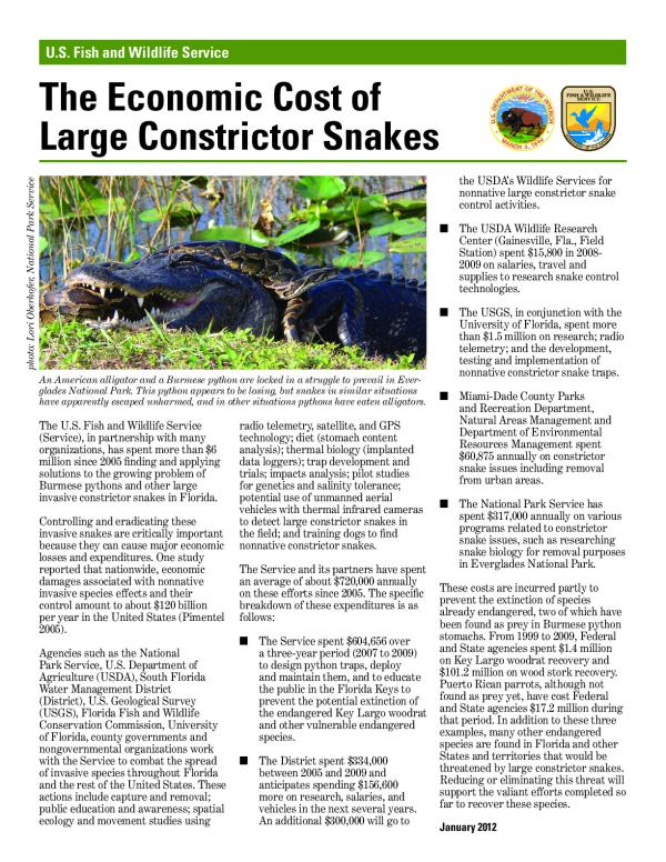 The U.S. Fish and Wildlife Service (Service), in partnership with many organizations, has spent more than $6 million since 2005 finding and applying solutions to the growing problem of Burmese pythons and other large invasive constrictor snakes in Florida. Record Created: 10-Jun-2016