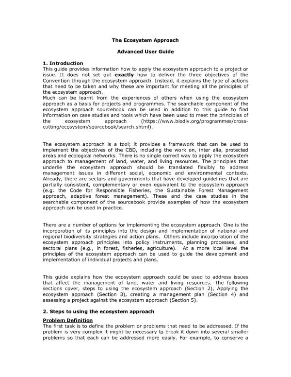 This guide provides information how to apply the ecosystem approach to a project or issue. It does not set out exactly how to deliver the three objectives of the Convention through the ecosystem approach. Instead, it explains the type of actions that need to be taken and why these are important for meeting all the principles of the ecosystem approach.