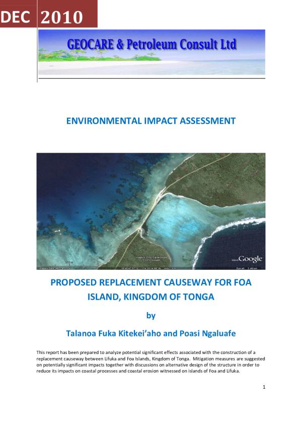 The purpose of the action is to improve transportation and reduce maintenance cost by upgrading causeway between Foa and Lifuka Islands, to become more resilient and less vulnerable to impacts of high energy waves. Built in the period 1978-1979, the raised coral structure has served the people of Foa and Lifuka well despite increasing maintenance cost. The replacement structure is similar to the existing one but with rock armoring to reduce the energy of waves impacting on the structure and culverts in the middle to encourage water flows to the western side of the Causeway. The estimated cost of construction is about TOP4.67 million. Environmental effects requiring specific analysis are limited to the followings; · possible effect of the structure on coastal erosion · dispersion of fine sediment from the construction site and its possible effects on fauna and flora in the nearby areas. Other effects considered in the analysis include social issues on fisheries and tourism, health issues on fish poisoning and on biological communities of the areas.
