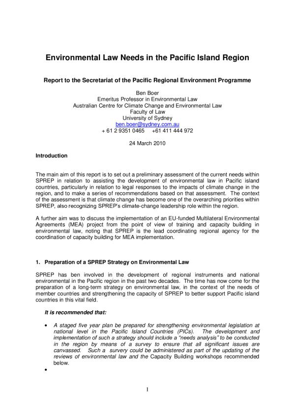 The main aim of this report is to set out a preliminary assessment of the current needs within SPREP in relation to assisting the development of environmental law in Pacific island countries, particularly in relation to legal responses to the impacts of climate change in the region, and to make a series of recommendations based on that assessment. The context of the assessment is that climate change has become one of the overarching priorities within SPREP, also recognizing SPREPs climate-change leadership role within the region.