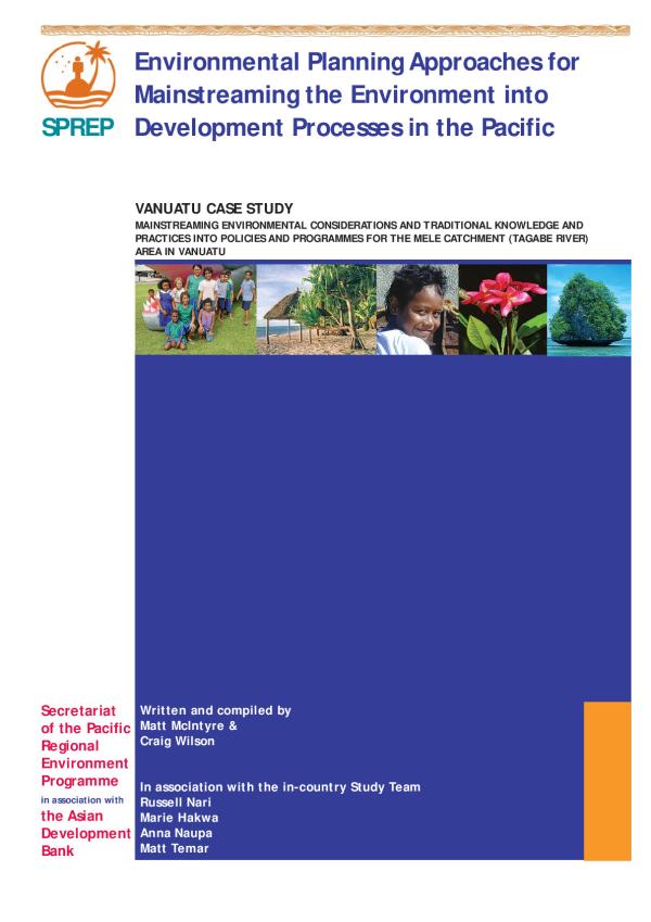 The Government of Vanuatu approached SPREP in 2001 to consider providing technical and advisory assistance in assessing the aggregated issues of land use change, rural development, catchment management and cumulative infrastructure and coastal degradation in the Mele catchment, immediately northwest of the municipality of Port Vila, Efate, Vanuatu. This request was formalized in early 2002 as part of a SPREP Sustainable Economic Development Division, country visit. The request was of interest to SPREP as it was consistent with the programme objectives of its Integrating Environment and Development key focus area and the Integrated Assessment and Planning project under this programme component. Corresponding with the early case study design the Nadi High Level Ministerial Meeting on Financing the Environment (Adaptation May 2002), called for practical case studies to address nominated barriers to sustainable development. At that same meeting the ADB communicated its intention to produce the Pacific Regional Environment Strategy (PRES) to guide its strategic direction and assistance in the region for the 20052009 period. This strategy would utilize a number of case studies to draw out best practices and lessons to be addressed in the PRES.
