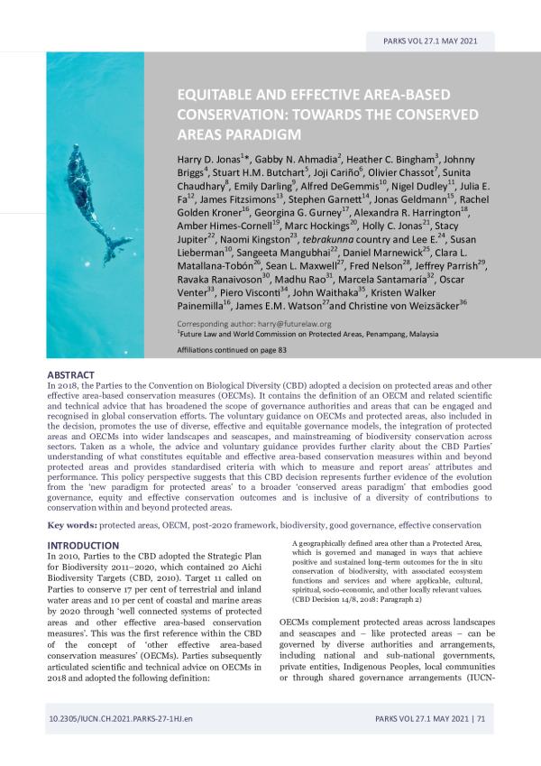 In 2018, the Parties to the Convention on Biological Diversity (CBD) adopted a decision on protected areas and other effective area-based conservation measures (OECMs). It contains the definition of an OECM and related scientific and technical advice that has broadened the scope of governance authorities and areas that can be engaged and recognised in global conservation efforts. The voluntary guidance on OECMs and protected areas, also included in the decision, promotes the use of diverse, effective and equitable governance models, the integration of protected areas and OECMs into wider landscapes and seascapes, and mainstreaming of biodiversity conservation across sectors.